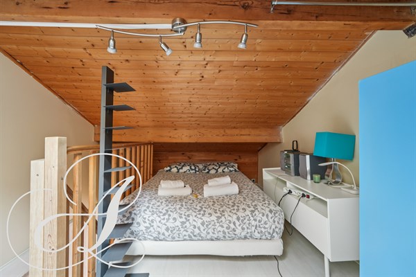 Niché au 1er étage sans ascenseur d’un immeuble de caractère, ce bien de 19 m² loi Carrez (30 m² au sol) offre une distribution parfaitement pensée. Dès l’entrée, vous découvrez une pièce de vie lumineuse, aux volumes agréablement exploités, prolongée par une cuisine ouverte, entièrement équipée. L'appartement dispose d'une connexion internet et d'une salle de douche avec WC. L’espace nuit en mezzanine, véritable écrin suspendu, confère à l’ensemble une atmosphère intimiste et chaleureuse, tout en libérant un espace de vie confortable et fluide avec des rangements pour vos effets personnels. Vous serez totalement au calme : depuis la cuisine et la mezzanine, vous donnez sur la cour, depuis le salon sur un impasse piétonne derrière l'immeuble.